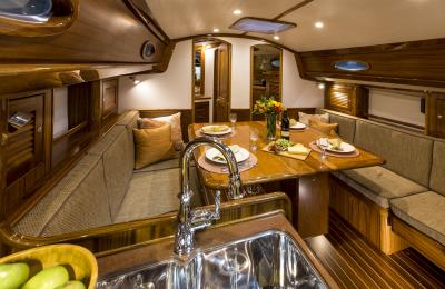 Bright and efficient salon with twin settees, teak trim, and clever storage, offering both style and practicality below deck. Courtesy Wellington Yacht Partners